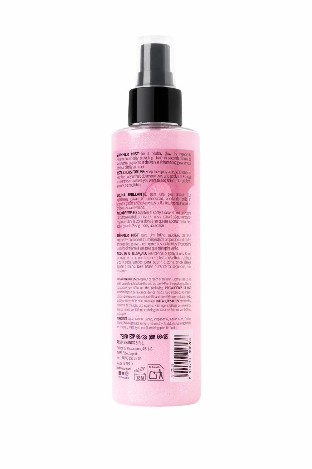Shimmer Mist for a healthy glow. Its ingredients enhance luminosity providing shine in seconds thanks to shimmering pigments. It delivers a shimmering glow to your skin that distills summer.